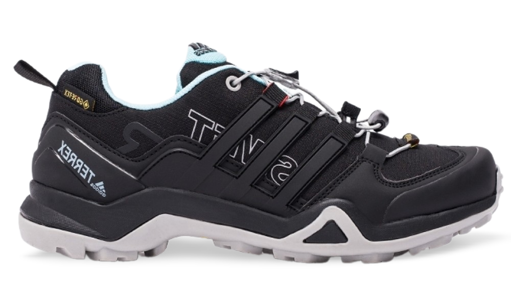 - Логотип: три полоски, трилистник Adidas, надпись Terrex